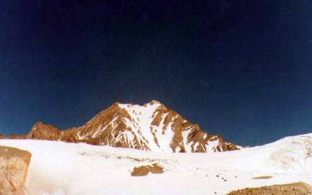 Cuerno Blanco (5000m, izquierda) y Cerro Bello (5200m, 1000m hielo 55°).