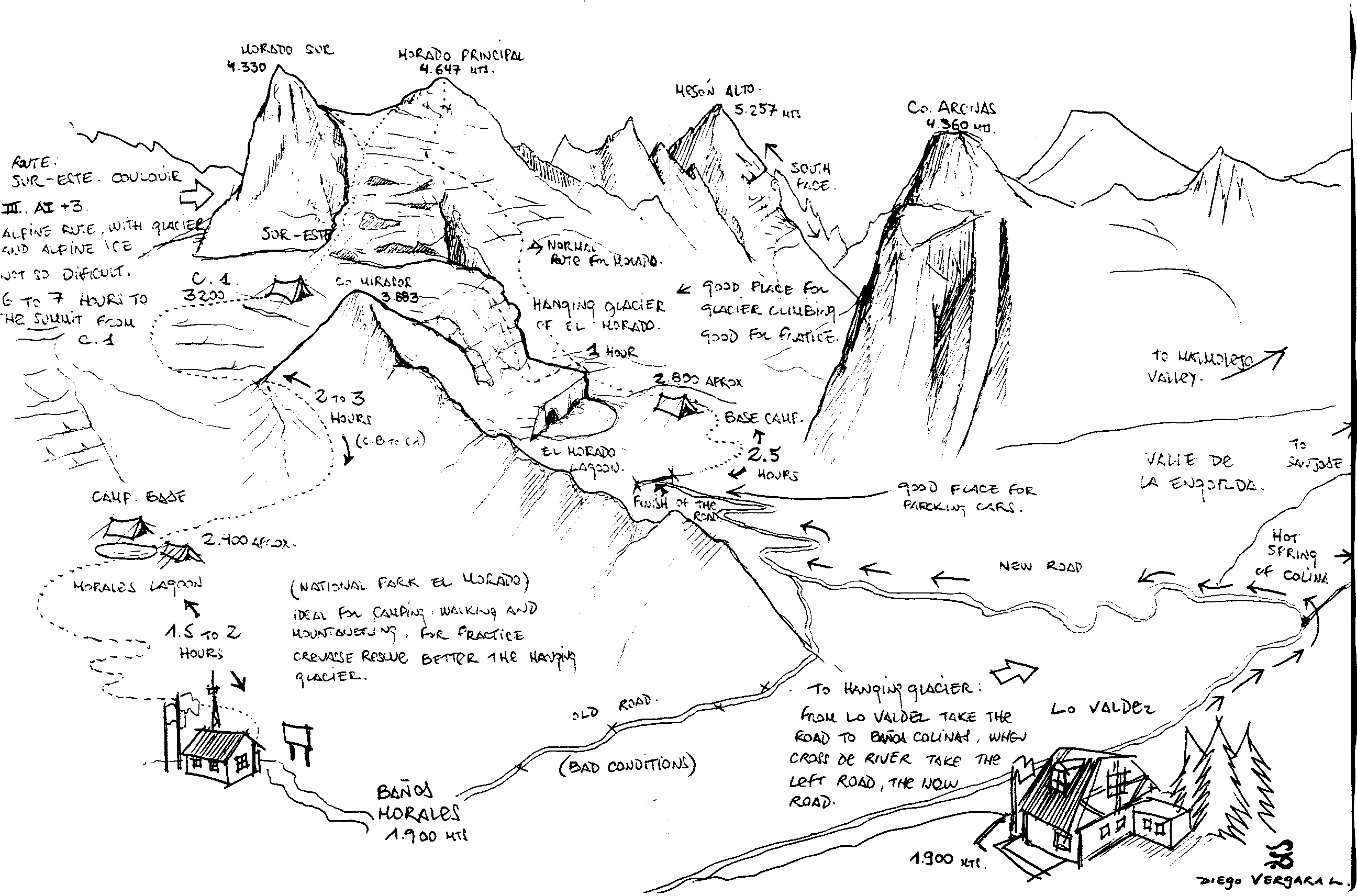 ![]() Panorama visto del Refugio Alemán, dibujo de Diego (clic encima para agrandar) |